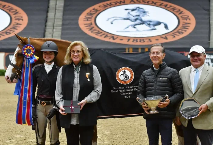 But for Babylon’s trainer John French, it was the final competition of the year, the National Horse Show (Kentucky). During Babylon’s four years in the 3’6″ ring—first under French’s saddle, then owner Ariana Marnell’s and finally, in 2024, Walkenbach’s—he’s become the horse half the show grounds will trot to the main ring to watch, which leads to immense pressure on all his connections. At the National, that pressure faded as Walkenbach and the flashy chestnut truly melded, winning not only the division and grand junior hunter championships, but the overall grand champion as the top hunter out of all the divisions at the show.